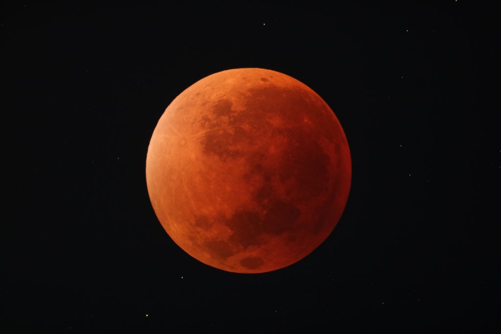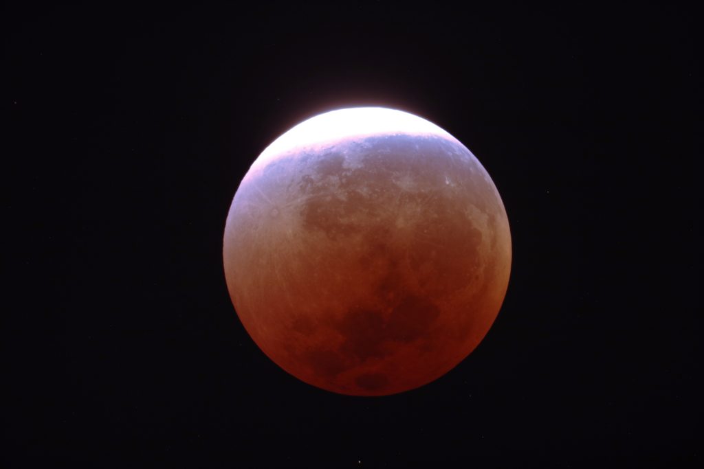 皆既月食中の月。月の左下7時の方向に見られる白い点が、天王星です。