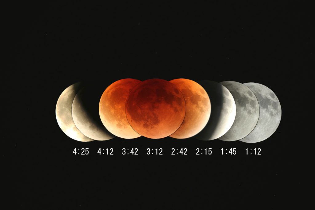 皆既月食の全経過です。皆既食終了後に雲が出てきたのが残念です。