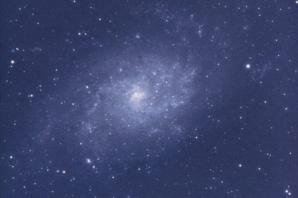 11月は、透明度の良い星空を見ることができます。澄み切った晩秋の夜空では天の川銀河に一番近い銀河「アンドロメダ銀河M31」がとても有名です。しかし秋の夜空には、認知度は低いですが注目すべきとても美しい銀河がもう一つあります。それは「アンドロメダ座」の南に位置する「さんかく座」にある「さんかく座銀河M33」です。この銀河も「アンドロメダ銀河」同様暗い場所では双眼鏡でも簡単に見つけることができる銀河で、渦巻から伸びる腕の広がりはとても興味深く、大口径の望遠鏡で低倍率で楽しむことができる銀河です。